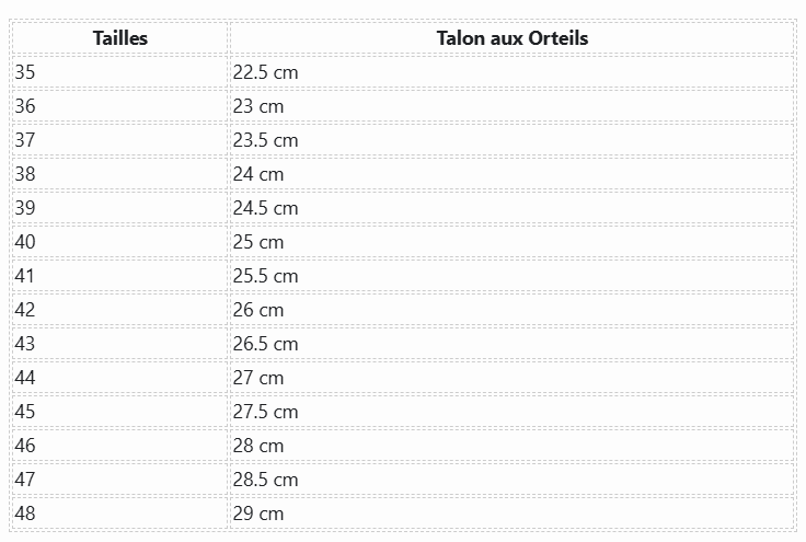 Si vos pieds sont larges ou épais, nous vous conseillons de choisir une taille au-dessus de votre pointure habituelle.